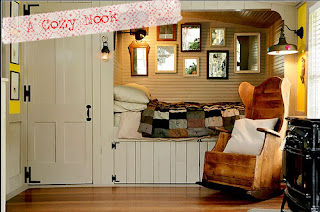 This image looked like a cozy nook to curl up in and just read the day away. You can see the window from the bed, which I like because I stop reading and just day dream on rainy days like this and if you got too cold you could drag the rocker over to that adorable stove.
